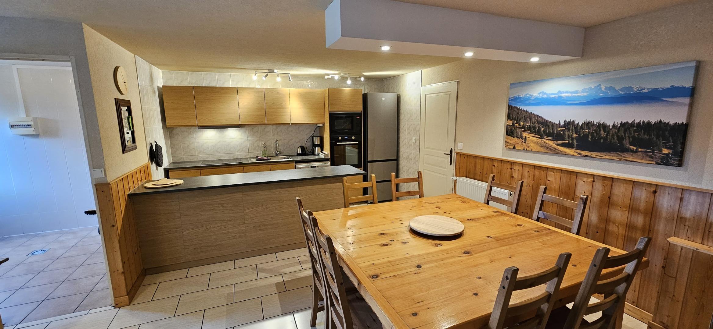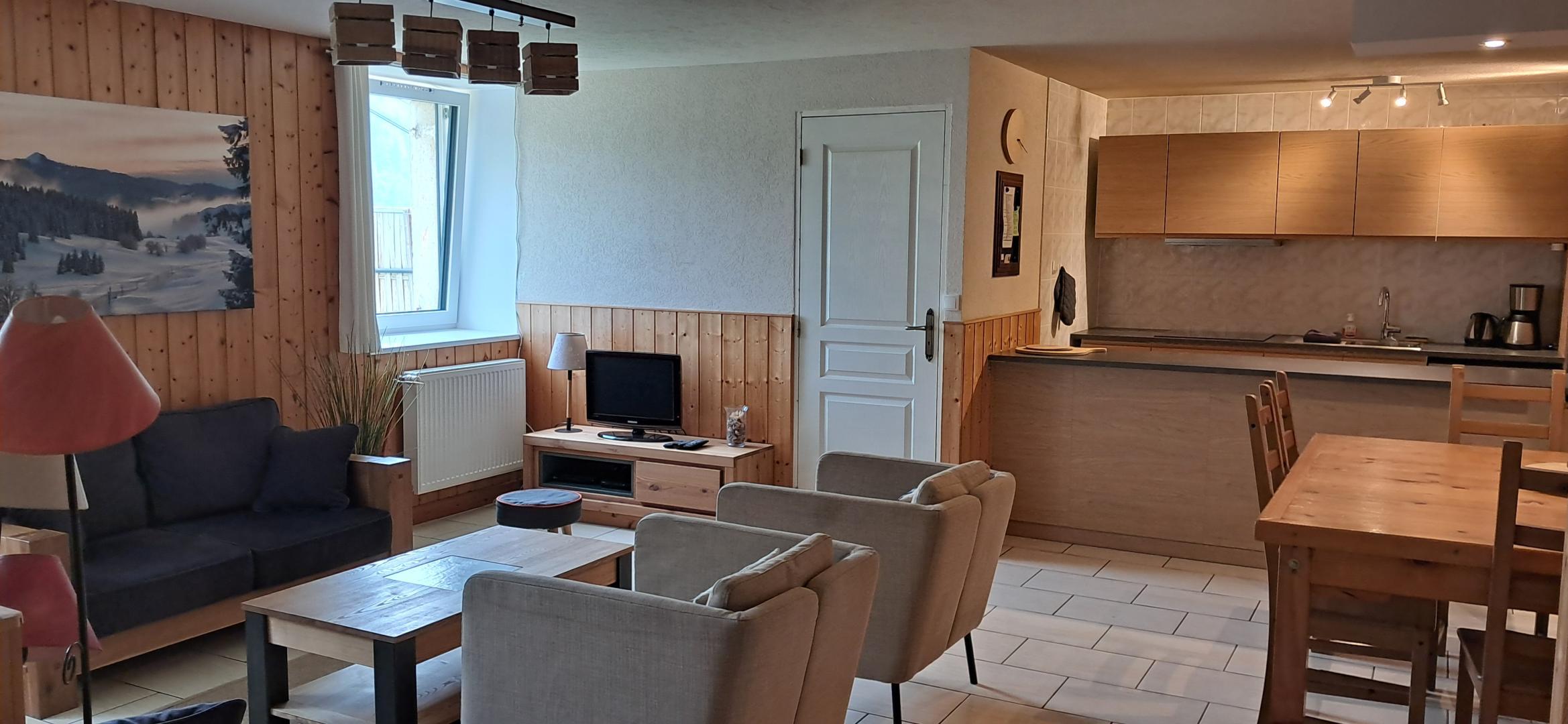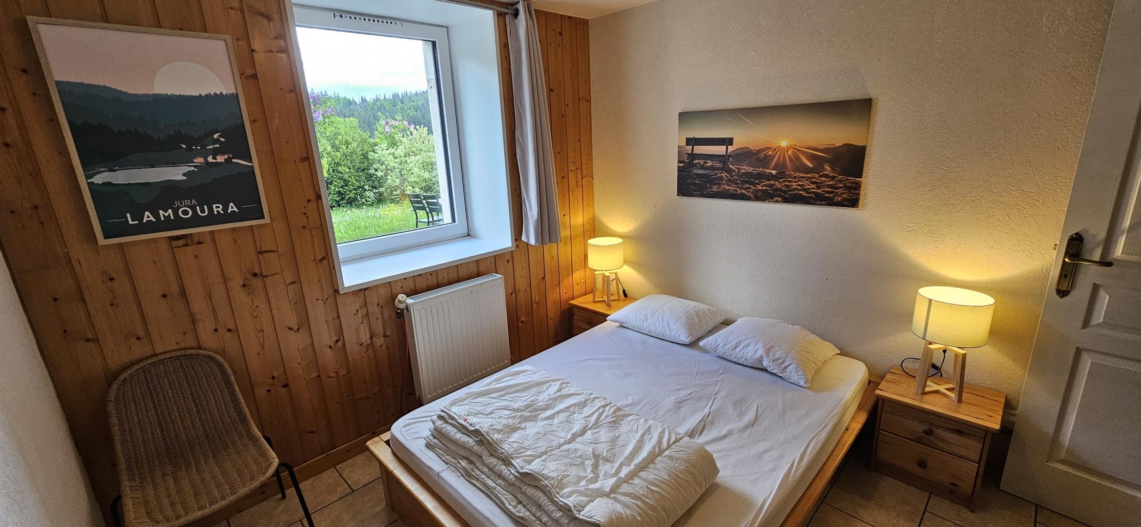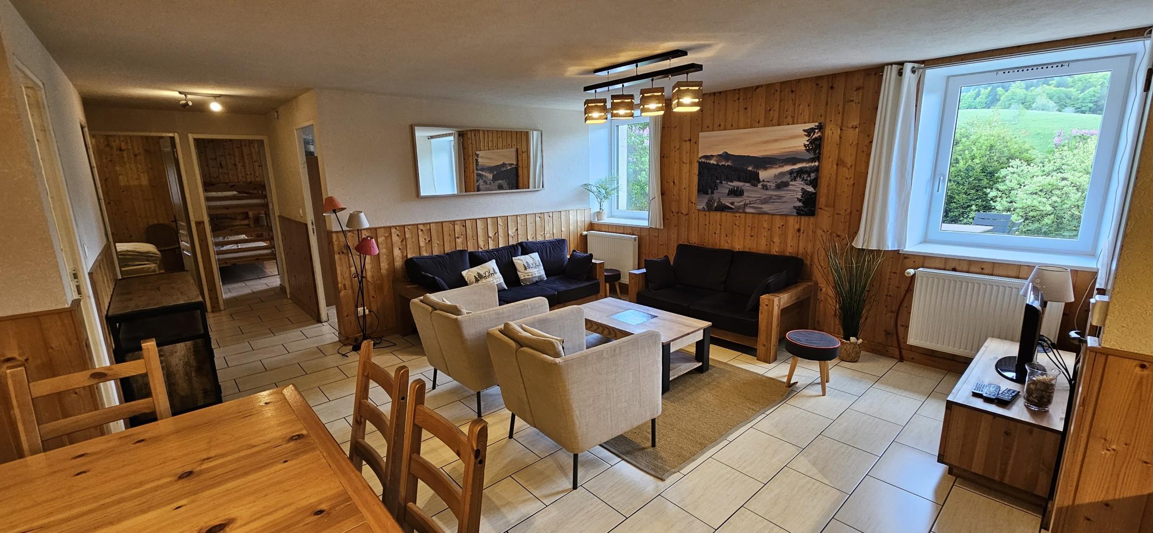 A quelques pas du centre du village et tout près des pistes de ski de fond, gîte de plain -pied aménagé au rez de chaussée d'une ferme typique du Haut Jura. Cuisine intégrée toute équipée (micro - ondes), salon - séjour ( Lecteur DVD), salle de Bain, 2wc dont un indépendant, Ch1 : 1 lit 2pl, ch2 : 2 lits 1pl superposés + 1 lit gigogne (1pl) + 1 lit 1pl, ch3 : 1 lit 2pl. Chauffage central. Terrain attenant non clos, terrasse, barbecue, salon de jardin. Parking déneigé l'hiver. Local à skis chauffé. Vue imprenable sur la nature environnante depuis la terrasse, bercé par le son des clarines. Toutes charges comprises. Taxe de séjour en sus. Forfait ménage à 100€. Informations complémentaires : gîte non fumeur - fête non acceptée
