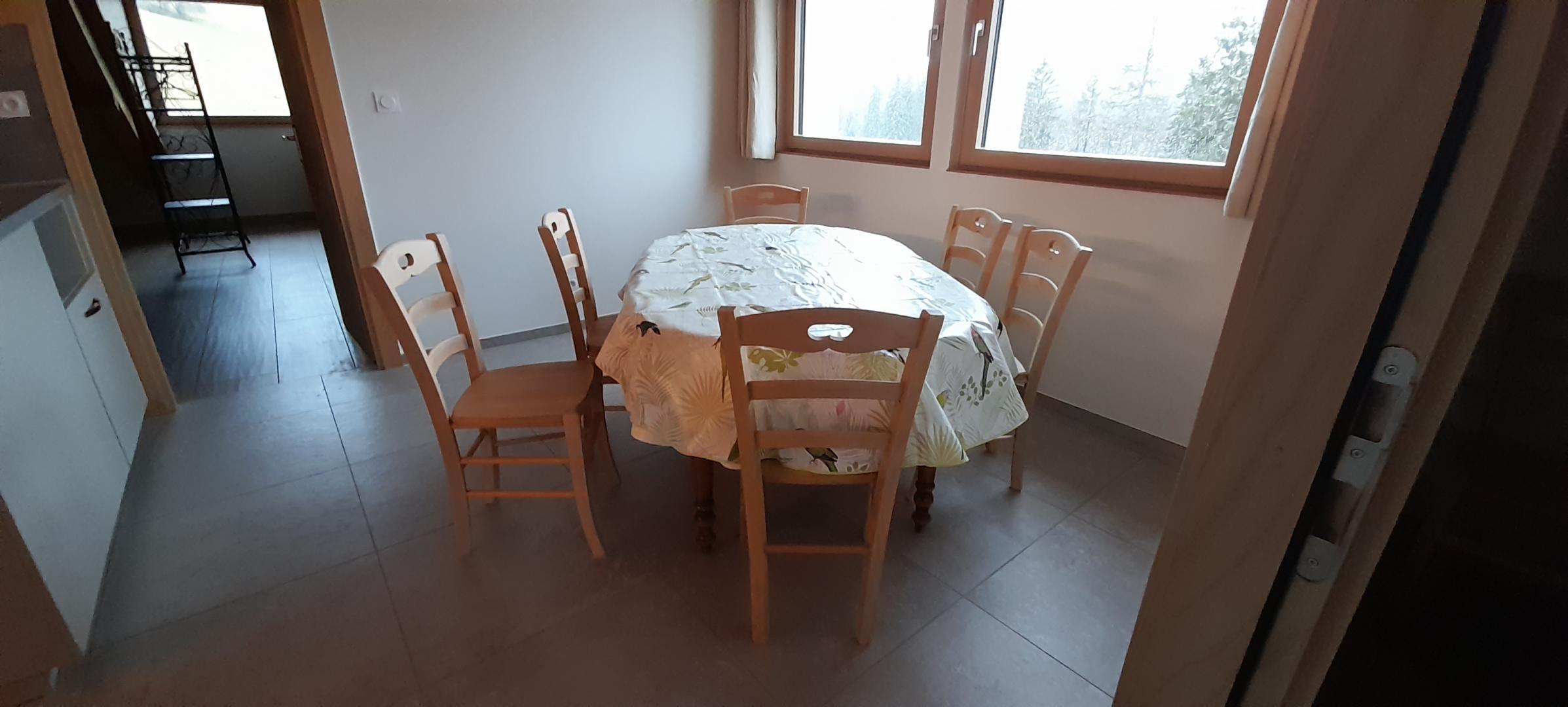 string(840) "Ce logement au 2ème étage d'une maison abritant d'autres gîtes se compose d'une pièce de vie avec cuisine équipée, d'un coin salle à manger et d'un espace salon avec canapé convertible, d'une chambre avec un lit double (140*190) et de 2 chambres avec chacune 2 lits simples, d'une salle d'eau avec douche et d'un WC indépendant. Côté extérieur, vous pourrez profiter d'un terrain non attenant avec terrasse équipée d'un salon de jardin, de transats et d'un barbecue. Chauffage central. Toutes charges comprises. Gite non fumeur. A 5 mns en voiture du centre du village où vous trouverez toutes les commodités : pharmacie, restaurants, bureau de tabac, supermarché... nombreuses activités : ski de fond, ski de descente, visite des caves d'affinage, commando Game... Parking privé à 30 mètres et volets dans les chambres"