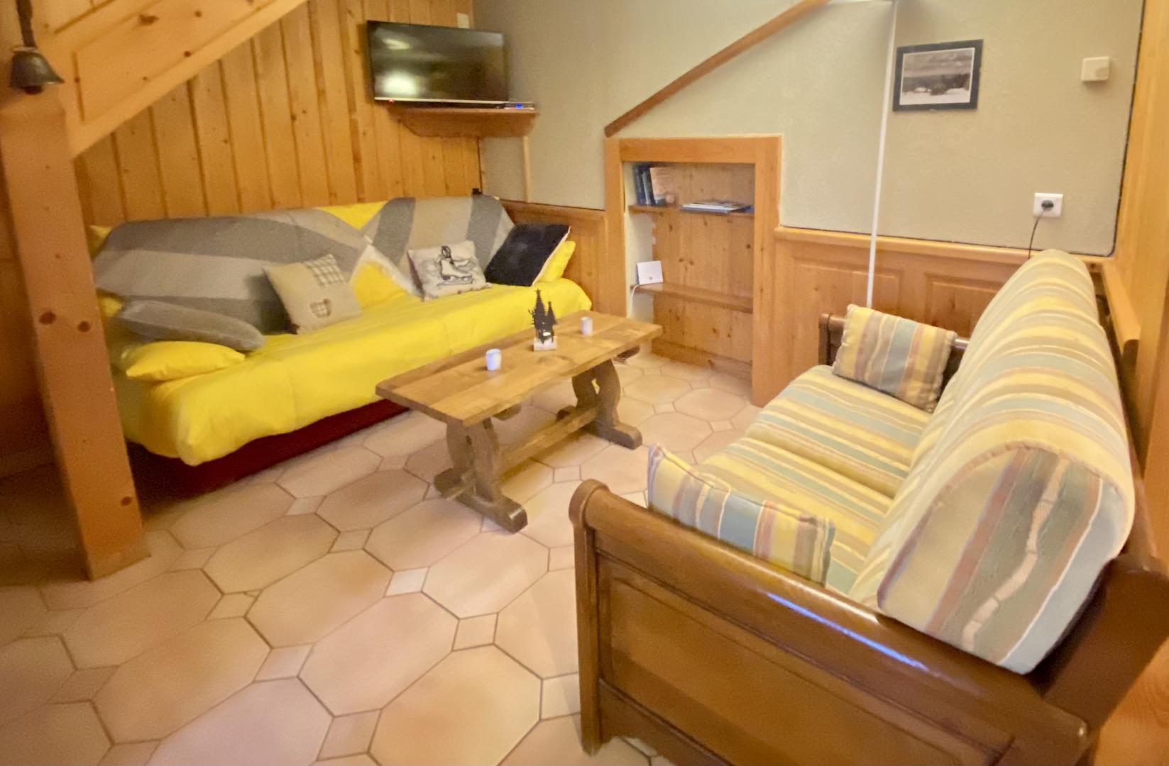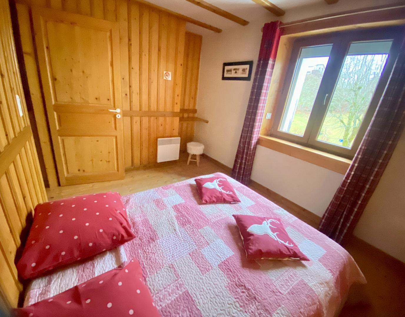 Logement à l'étage. Séjour, coin-cuisine, salon, canapé convertible, ch1: 1 lits 2 pl (160cm), ch2: 1 lit 2 pl et 2 lits 1 pl superposés, salle de bains, salle d'eau, terrain attenant non clos, salon de jardin, barbecue, parking privé déneigé. Chauffage électrique. Toutes charges comprises en été.