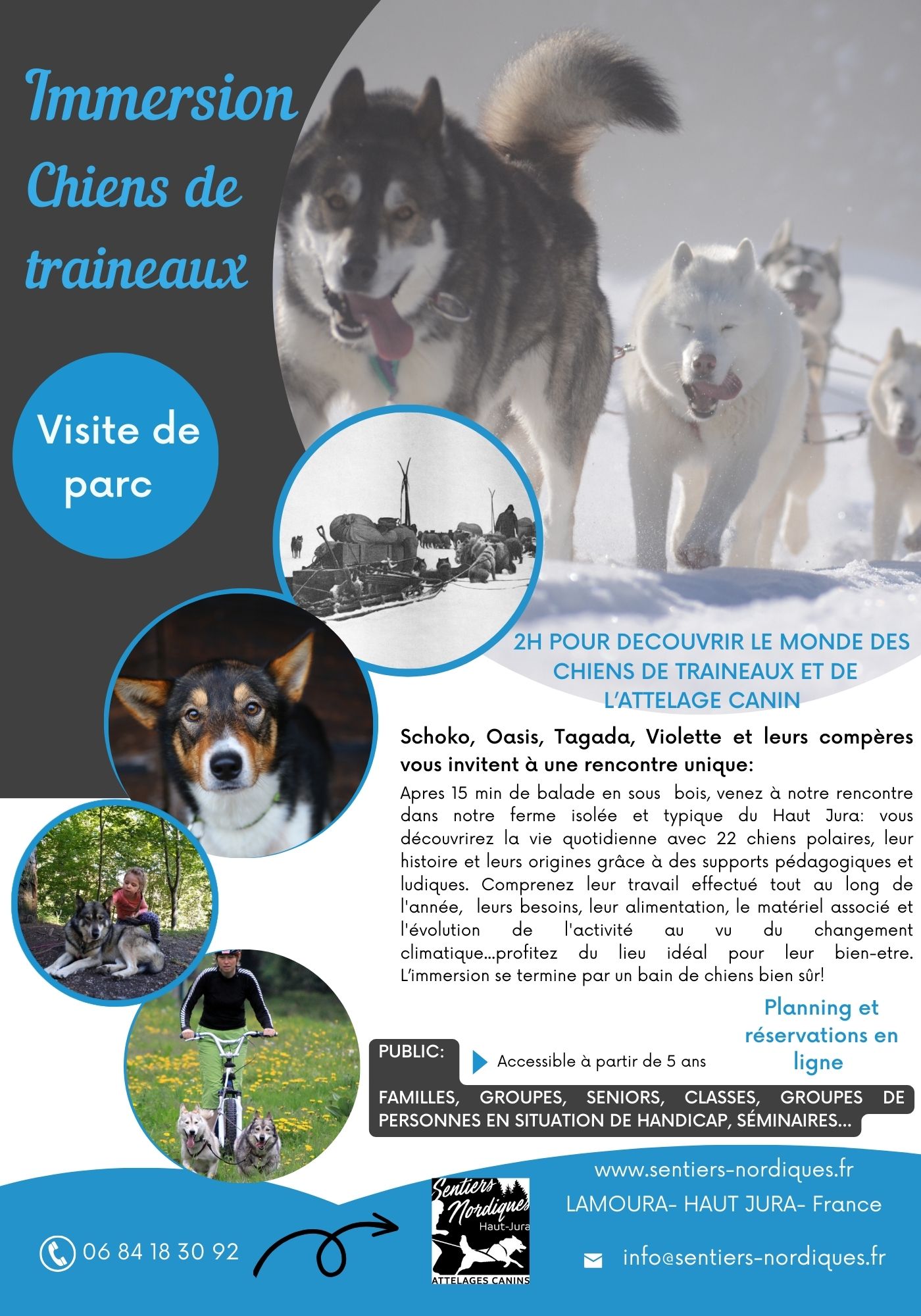Apres 15 min de balade en sous bois, venez à notre rencontre dans notre ferme isolée et typique du Haut Jura: vous découvrirez la vie quotidienne avec 22 chiens polaires, leur histoire et leurs origines grâce à des supports pédagogiques et ludiques. Comprenez leur travail effectué tout au long de l'année, leurs besoins, leur alimentation, le matériel associé et l'évolution de l'activité au vu du changement climatique...profitez du lieu idéal pour leur bien-etre. L’immersion se termine par un bain de chiens bien sûr!