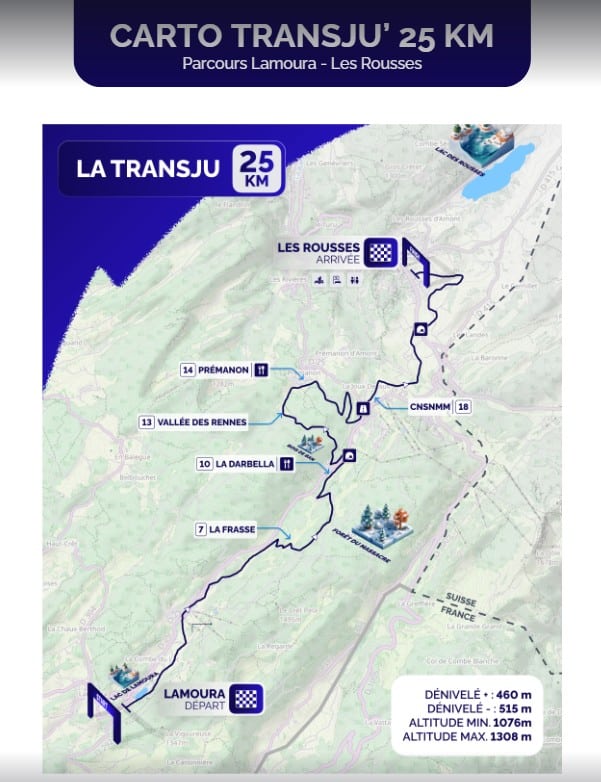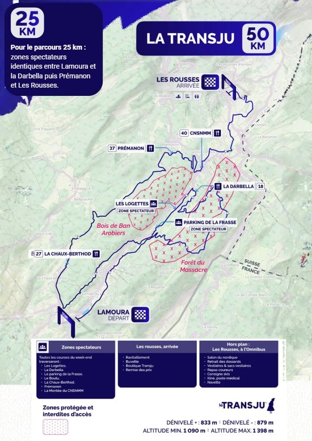 Pour le parcours 25 km : zones spectateurs identiques entre Lamoura et la Darbella puis Prémanon et Les Rousses.